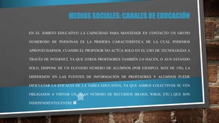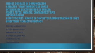 Este documento trata sobre diferentes medios de comunicación social como blogs, redes sociales, YouTube, Flickr, Google+, Second Life, microblogging y enlaces. Describe cómo crear y mantener blogs e integrar contenidos multimedia. Explica el funcionamiento de redes sociales populares y cómo administrar contactos y enlaces entre sitios web.