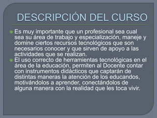 Este curso enseña el uso de herramientas tecnológicas para apoyar la educación, incluyendo organizadores como mapas mentales, el manejo de plataformas virtuales, redes sociales, correo electrónico, creación de contenido en la web, y wikis. Los objetivos son asignar competencias tecnológicas a los estudiantes y conocer cómo aplicar estas herramientas en la educación. El curso usa métodos como el aprendizaje basado en problemas y proyectos, con soporte en redes sociales, correo electr