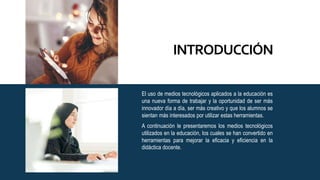El documento describe los medios tecnológicos más utilizados en la educación, incluyendo computadoras, tabletas, redes sociales, proyectores, video y radio. Explica que estos medios facilitan el acceso a la educación y mejoran la eficacia de la enseñanza al fomentar la colaboración, exploración de conocimientos y comprensión. También brindan autonomía a los estudiantes para construir su propio aprendizaje. La conclusión es que los medios tecnológicos son una herramienta ú