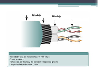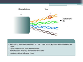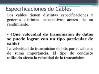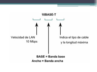 El documento describe diferentes tipos de cables de red y sus especificaciones. Explica que el tipo de cable afecta la velocidad y distancia de transmisión de datos. Detalla los estándares 10BASE-T, 10BASE5 y 10BASE2 de Ethernet, incluyendo sus velocidades de transmisión, tipos de transmisión y distancias máximas. También cubre 1000BASEFX, cable coaxial, cable STP y cable UTP.