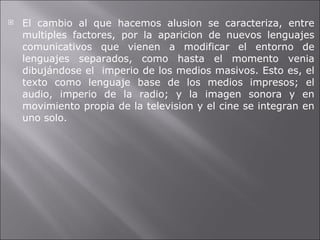 Los medios de comunicación cambian junto con la sociedad. Los medios masivos tradicionales han sido reacomodados por los medios interactivos como Internet, que integran texto, audio e imágenes. La World Wide Web ha impulsado el desarrollo de Internet y ha masificado su uso. Aunque muchos medios masivos exploran el ciberespacio a través de sitios web, trasladar contenidos de la versión impresa a la versión en línea no basta y se deben aprovechar mejor los recursos hipertextuales e hipermediales.