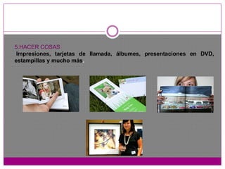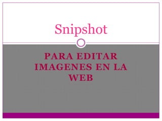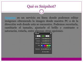 Snipshot es un servicio en línea para editar imágenes de forma sencilla sin necesidad de instalar software. Permite recortar, cambiar el tamaño, ajustar brillo y contraste u otros parámetros de imágenes subidas o en línea. Incluye una extensión de Firefox que agrega un menú para editar imágenes fácilmente. Flickr es un servicio para compartir y organizar fotos en línea de forma gratuita, permitiendo subir, editar, organizar en colecciones y compartir fotos de forma privada o pública.