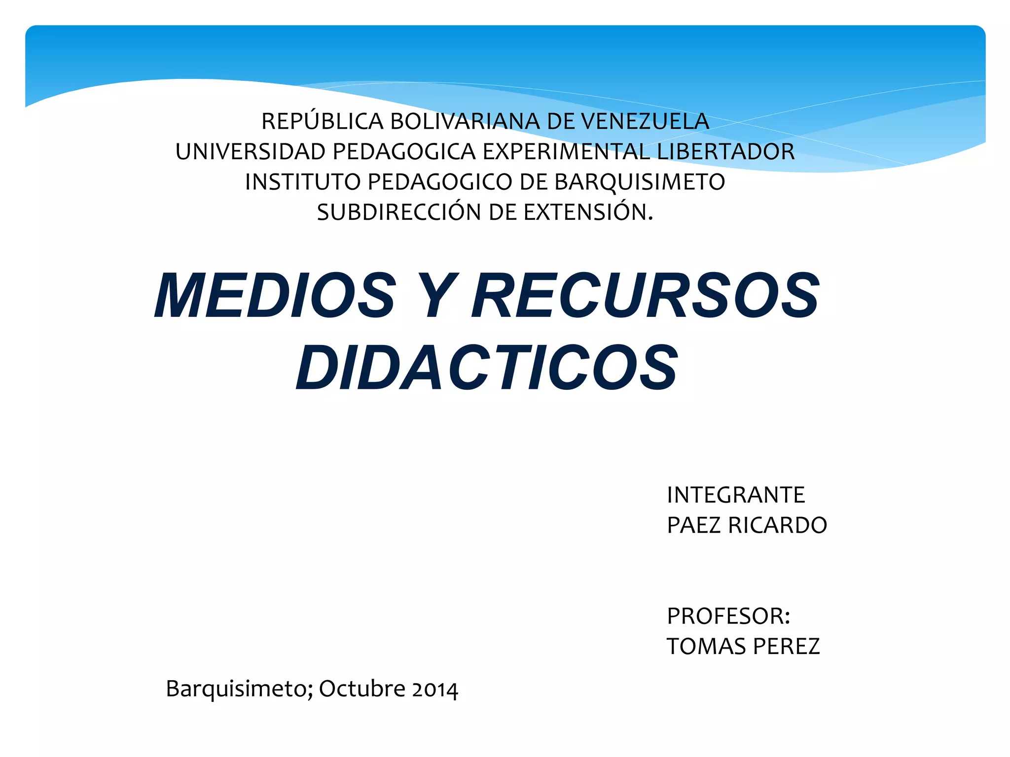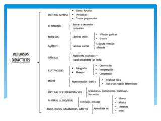 El documento aborda la utilización de medios y recursos didácticos para facilitar el proceso de enseñanza y aprendizaje, diferenciando entre medios didácticos diseñados específicamente para la educación y recursos didácticos que son adaptados para tal fin. Se destacan criterios de selección para estos materiales, enfatizando su funcionalidad y la importancia del rol del docente en el proceso educativo. Al final, se concluye que la diversidad en los recursos es fundamental para atender las distintas formas de aprendizaje de los alumnos.