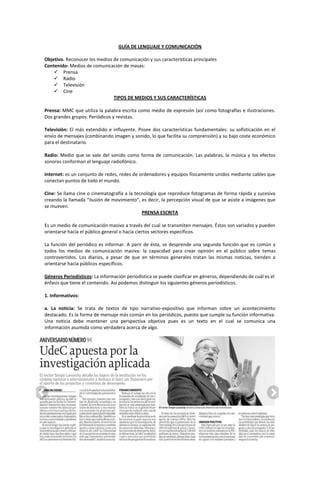 Los medios de comunicación principales incluyen la prensa, la radio, la televisión, el cine e Internet. La prensa utiliza la palabra escrita, los periódicos y revistas informan sobre noticias y eventos actuales. La radio se basa en el sonido y las palabras para comunicarse con los oyentes. La televisión combina imagen y sonido para transmitir mensajes de manera sofisticada y de bajo costo. El cine reproduce fotogramas para crear la ilusión de movimiento.