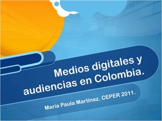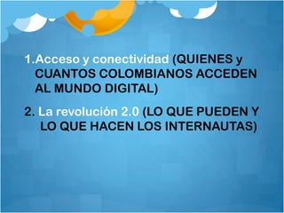 Este documento resume los hallazgos de un estudio sobre el acceso y uso de Internet en Colombia. Muestra que aunque la penetración digital ha crecido, todavía es baja y existe una brecha entre áreas urbanas y rurales. Los colombianos usan Internet principalmente para contenido generado por usuarios y redes sociales. Aunque el activismo digital concierne a una minoría, iniciativas en línea a menudo ganan atención en otros medios. El documento concluye que el panorama de la información está cambiando a medida que las audiencias adoptan nue