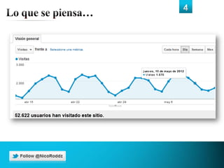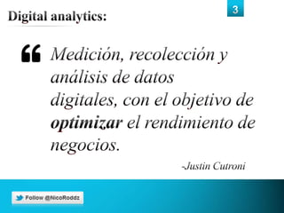 Este documento presenta cuatro métricas clave para medir el éxito de una campaña de marketing digital: 1) volumen de tráfico, 2) calidad de tráfico, 3) experiencia del usuario, y 4) conversiones. Explica la importancia de medir estas métricas para comprender el comportamiento de los usuarios y optimizar las campañas para lograr los objetivos deseados.