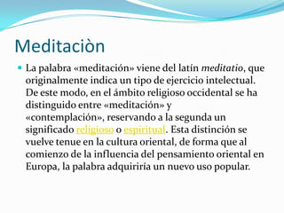 La meditación implica concentrarse en un objeto como la respiración, un pensamiento o la propia consciencia para alcanzar un estado mental enfocado. Se originó en la India como parte del yoga y fue adoptada por los teósofos en el siglo XIX para referirse a prácticas de recogimiento interior en religiones orientales como el hinduismo y el budismo. La meditación normalmente implica concentrarse en el momento presente, disolver la mente de pensamientos o enfocarla en Dios u otro objeto único.