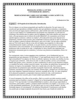 El documento presenta el primer capítulo de un libro sobre la educación y el significado de la vida. El autor argumenta que el propósito de la educación no debería ser solo preparar a los estudiantes para los exámenes y conseguir un empleo, sino ayudarlos a comprender el proceso total de la vida. También sostiene que la educación debería crear un ambiente libre de miedo para que los estudiantes puedan descubrir por sí mismos la verdad y ser inteligentes. Finalmente, plantea que la educación debería darles