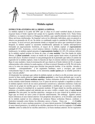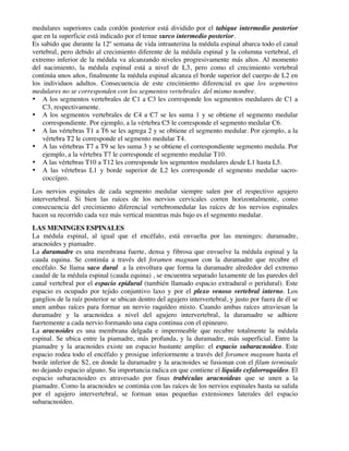 La médula espinal tiene una longitud de aproximadamente 45 cm y está compuesta de sustancia gris en forma de H y sustancia blanca. Está envuelta por tres meninges - la duramadre, aracnoides y piamadre - y contiene el canal central lleno de líquido cefalorraquídeo. La médula espinal da origen a 31 pares de nervios espinales a través de raíces posteriores sensitivas y anteriores motoras.