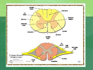 El documento describe la anatomía y función de la médula espinal. Resume que la médula espinal se encuentra dentro del canal raquídeo, mide entre 42-45 cm de largo, y contiene sustancia gris en el centro y sustancia blanca en la periferia. La sustancia gris tiene forma de H y contiene los cuernos anteriores y posteriores, mientras que la sustancia blanca está dividida en tres cordones. La médula espinal transmite información sensorial ascendente y motora descendente a través de 31 pares de nervios raqu