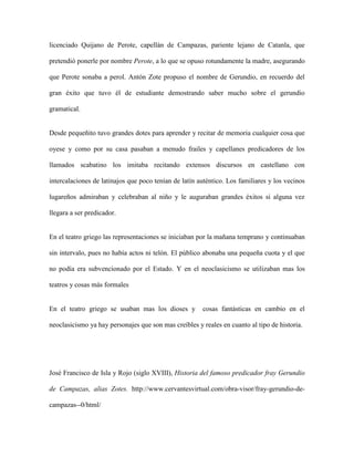 El documento resume la novela "Historia del famoso predicador fray Gerundio de Campazas, alias Zotes" de José Francisco de Isla. Critica el lenguaje barroco de la época a través de la historia de Fray Gerundio y su peculiar forma de hablar. Describe también el origen de Fray Gerundio, su educación y sus dotes para la predicación desde pequeño a pesar de su estilo poco convencional.