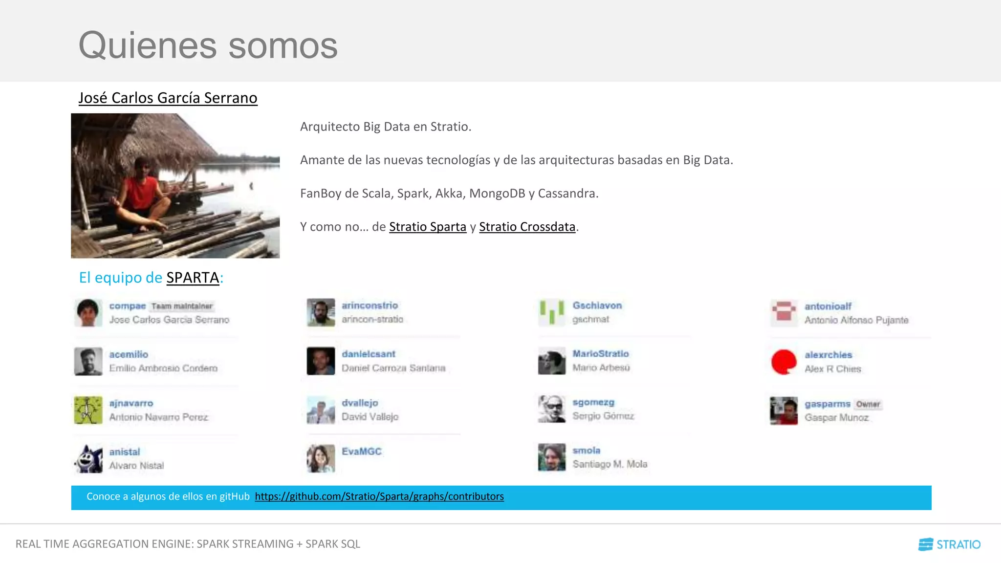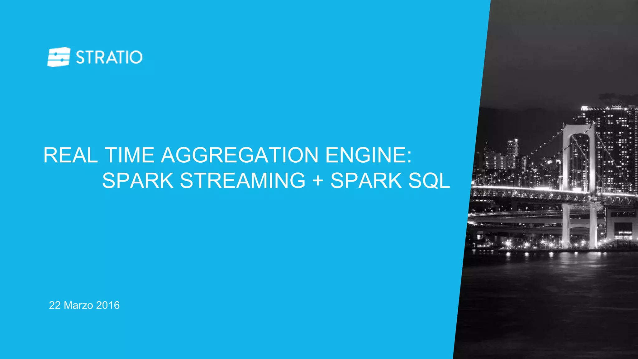 El documento presenta Stratio Sparta, un motor de agregación en tiempo real que combina Spark Streaming y Spark SQL. Describe la arquitectura, tecnologías utilizadas como Scala y Akka, así como las funcionalidades para receptores de datos, transformaciones, y operaciones avanzadas de streaming. Además, aborda problemas, recomendaciones y optimizaciones para el rendimiento en el manejo de datos en tiempo real.