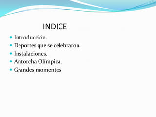 Los Juegos Olímpicos de 1968 se celebraron en la Ciudad de México entre el 12 y el 27 de octubre. Fueron los primeros Juegos en un país en desarrollo y en América Latina. Se compitieron en 20 deportes y se construyeron villas olímpicas para los atletas. Estados Unidos ganó la mayor cantidad de medallas de oro, mientras que México ganó 3 medallas de oro en sus propios Juegos Olímpicos.
