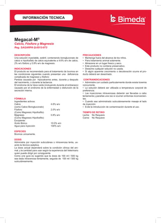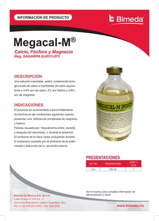 El documento proporciona información sobre el producto Megacal-M®, una solución inyectable que contiene calcio, fósforo y magnesio. Está recomendado para el tratamiento de bovinos con deficiencias de magnesio y fósforo que presenten paresia causada por hipocalcemia o el síndrome de la vaca caída. Se describe la fórmula, dosis, precauciones, contraindicaciones y tiempo de retiro del producto.