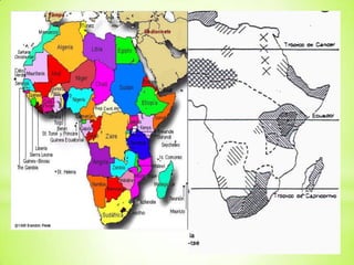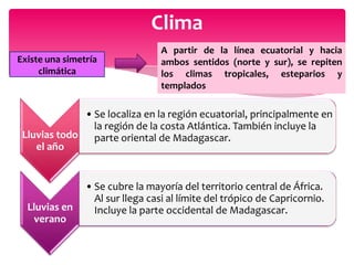 África tiene una diversidad de climas y países megadiversos como Madagascar, República Democrática del Congo y Sudáfrica. Madagascar es una isla con clima tropical y selvas subhúmedas. La República Democrática del Congo alberga especies endémicas como el solpugeira quarrei. Sudáfrica tiene una meseta definida por el "VELD" con praderas, sabanas y desiertos protegidos en 18 parques nacionales.