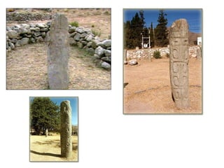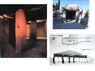 Este documento describe la arquitectura megalítica de la fachada atlántica europea y las islas Baleares. Explica que los megalitos eran monumentos prehistóricos construidos con grandes piedras con fines funerarios, como los dólmenes y túmulos. También describe varios tipos de megalitos como menhires, cromlechs y estructuras funerarias. Finalmente, detalla la arquitectura ciclópea única de las islas Baleares que incluye construcciones de grandes bloques de