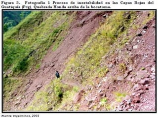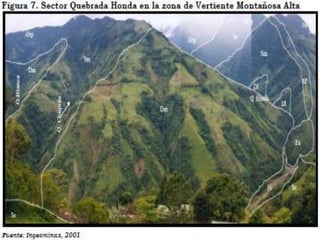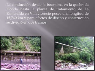El sistema de Quebrada Honda provee cerca del 70% del agua potable a Villavicencio. La conducción desde la quebrada hasta la planta de tratamiento mide 15.7 km y se divide en dos tramos. La evaluación del sistema encontró que la captación y conducción funcionan hidráulicamente, pero la vulnerabilidad de los pasos subfluviales y la inestabilidad de las laderas del primer tramo requieren medidas de protección y estabilización.