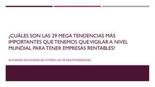 El documento analiza 29 megatendencias globales clasificadas en cuatro áreas: globalización económica, urbanización, tecnologías y telecomunicaciones, e industria. También se discute la política BYOD y su impacto en la administración de recursos, así como la necesidad de adaptar las empresas a estas tendencias para mantener su rentabilidad. Finalmente, se sugieren características y un perfil ideal para equipos de mercadotecnia y gerentes en este contexto cambiante.