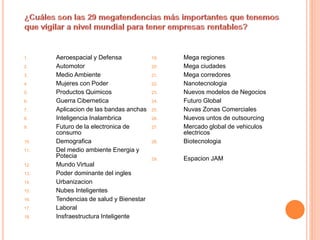 El documento presenta una lista de 29 megatendencias monitoreadas por Frost & Sullivan, incluyendo aeroespacial y defensa, automotor, medio ambiente, mujeres con poder, productos químicos, guerra cibernética, aplicación de bandas anchas, inteligencia inalámbrica, futuro de la electrónica de consumo, demográfica, energía y potencia del medio ambiente, mundo virtual, poder dominante del inglés, urbanización, nubes inteligentes, tendencias de salud y bienestar, laboral, infraestructura intelig