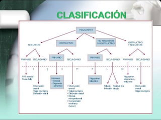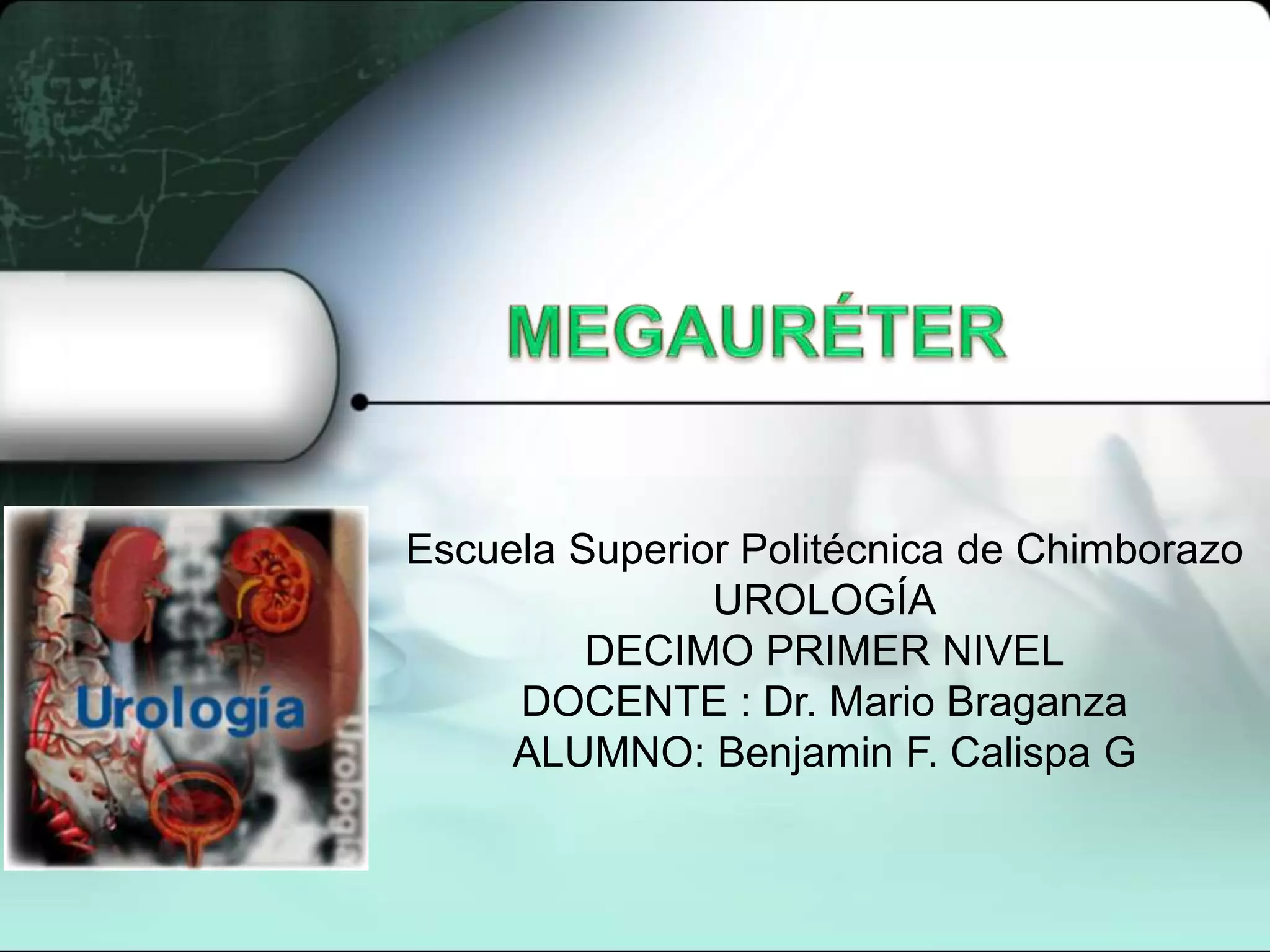 El documento habla sobre el manejo de las dilataciones del tracto urinario. Explica que el diámetro normal del uréter en niños varía con la edad pero casi nunca es mayor de 5 mm. También discute el diagnóstico y tratamiento del megauréter obstructivo y refluyente, incluyendo realizar reimplantaciones sólo en niños mayores de un año si existe una función renal menor del 20%.