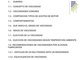 El documento proporciona información sobre la viscosidad de los aceites lubricantes. Explica que la viscosidad es la resistencia interna de un líquido a fluir, y que esta propiedad determina cómo funcionará el aceite en diferentes condiciones. También describe las clasificaciones SAE de viscosidad, los comportamientos de los aceites monogrado y multigrado, y las recomendaciones de viscosidad de varios fabricantes según la temperatura ambiente.