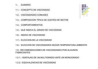 Este documento trata sobre la viscosidad de los aceites. Explica conceptos como la viscosidad cinemática, los grados de viscosidad SAE, las ventajas de los aceites multigrados sobre los monogrado, y las recomendaciones de viscosidad de diferentes fabricantes de acuerdo a la temperatura ambiente. El objetivo es brindar amplios conocimientos sobre la resistencia interna de los aceites y cómo esta propiedad determina su desempeño como lubricantes.