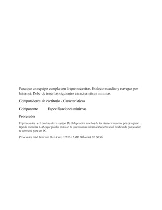Este documento proporciona especificaciones mínimas recomendadas para computadoras de escritorio y laptops para estudiantes universitarios. Para computadoras de escritorio, recomienda como mínimo un procesador Intel Pentium Dual-Core E2220 o AMD Athlon64 X2 6000+, 2 GB de RAM, un disco duro de 120 GB, un monitor de 17 pulgadas, y una unidad de CD/DVD. Para laptops, destaca la importancia del procesador, el sistema operativo, la memoria RAM, el disco duro, el tamaño y