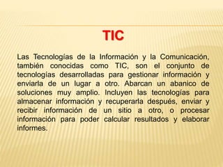 Las Tecnologías de la Información y la Comunicación (TIC) son tecnologías para gestionar, enviar y procesar información. Las TIC incluyen tecnologías para almacenar, enviar y recuperar información, así como procesarla para calcular resultados e informes. Las TIC están presentes en nuestras vidas y han transformado la ciencia, la técnica y la gestión empresarial a través de la digitalización y ordenadores potentes.