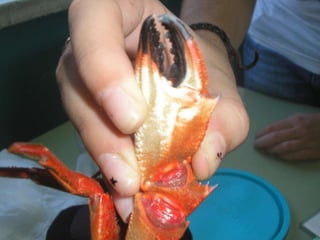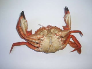 Este documento describe las partes principales del cuerpo de un crustáceo. Menciona que los crustáceos tienen un cefalotórax y un abdomen, dos pares de antenas, cinco pares de apéndices bucales (mandíbulas, maxilas y maxilípedos) y cinco pares de patas marchadoras. También describe algunos de los apéndices abdominales como el manto, la boca y las branquias.