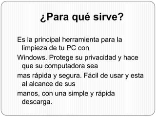 CCleaner es una herramienta diseñada para limpiar PCs con Windows, mejorando la velocidad y seguridad del sistema. Ofrece funciones como la eliminación de archivos temporales, desinstalación de programas y opciones de limpieza avanzada, así como configuraciones personalizables. Además, permite realizar copias de seguridad del registro y borrar archivos de manera segura.