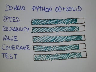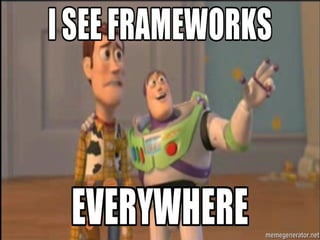 Este documento discute los frameworks y cómo pueden crear gran dependencia y limitar la flexibilidad del negocio. Propone centrarse en el negocio utilizando técnicas como Domain Driven Design, Clean Code y Test Driven Development con Python orientado a objetos puro. También sugiere usar abstracciones de bibliotecas para la infraestructura y entrega en lugar de frameworks, permitiendo así posponer decisiones y evolucionar el sistema a largo plazo de acuerdo con las necesidades del cliente.