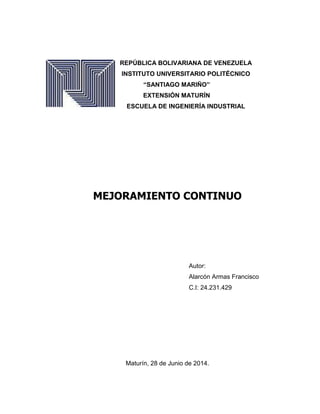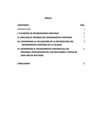 Este documento describe la filosofía y metodología del mejoramiento continuo. Explica que el mejoramiento continuo busca optimizar procesos, productos y servicios de manera constante sin alcanzar la perfección. Luego detalla las 7 fases del mejoramiento continuo: 1) identificar un área de mejora, 2) definir un problema y el proceso, 3) establecer resultados deseados, 4) seleccionar pasos para analizar, 5) obtener datos, 6) aplicar acciones correctivas, y 7) controlar resultados. El objetivo final es satisfacer al