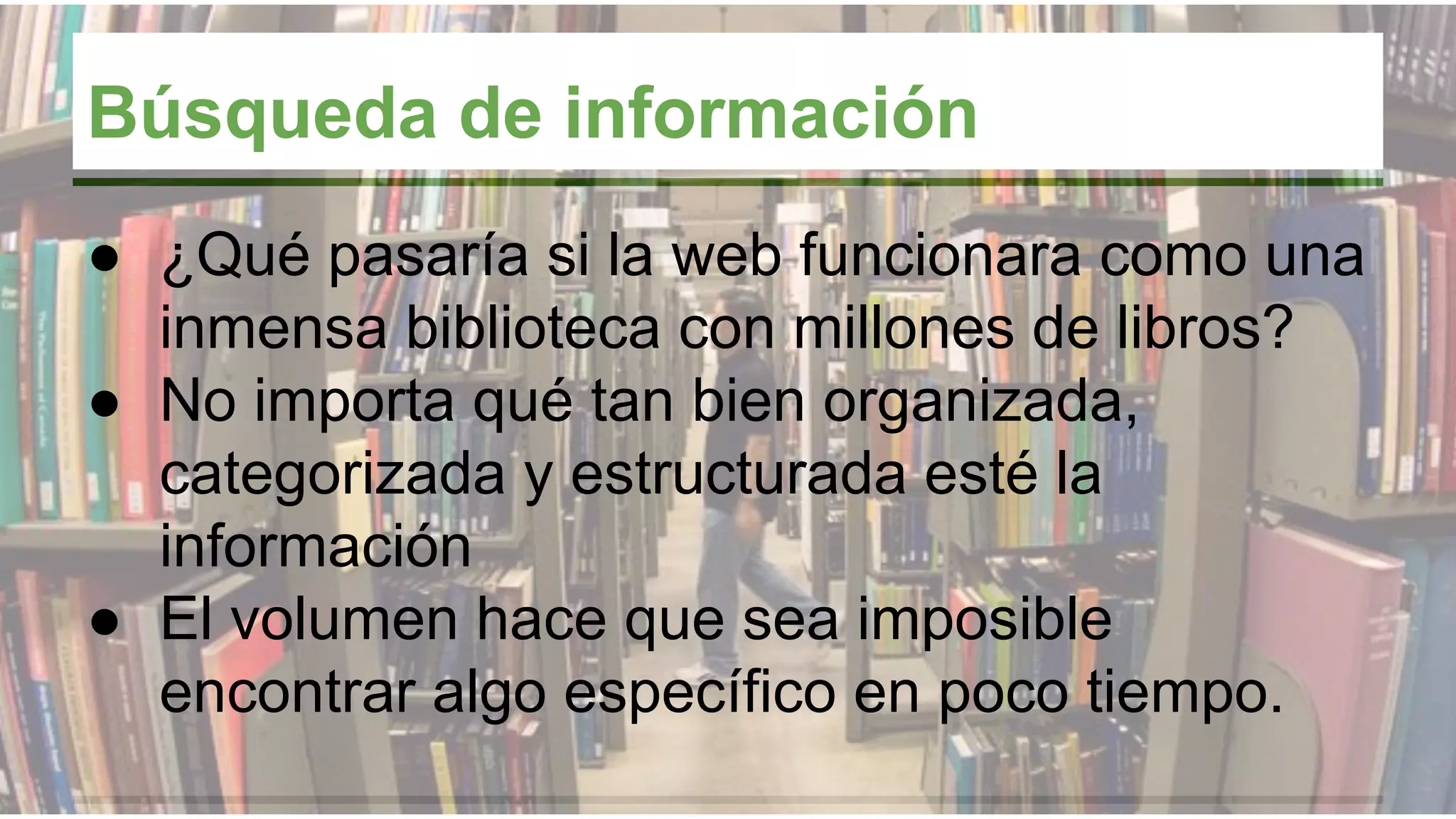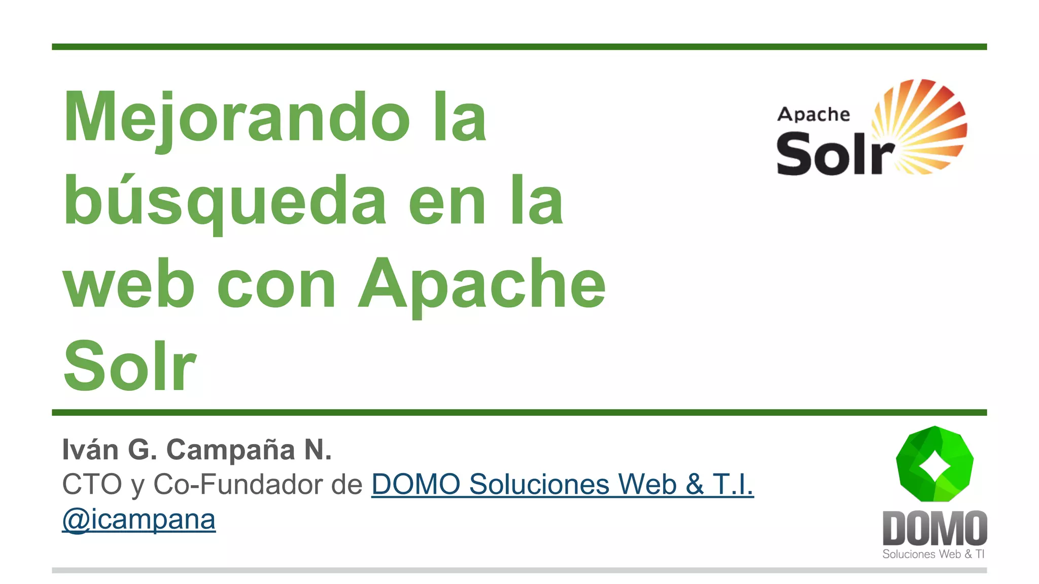 Este documento describe Apache Solr, un motor de búsqueda de código abierto que puede indexar y buscar documentos basándose en características especificadas. Solr permite búsquedas de texto completo, resaltado de términos, búsquedas por facetas y correcciones ortográficas. Se utiliza comúnmente para sistemas con grandes volúmenes de datos donde la búsqueda por múltiples parámetros es importante. Solr es independiente del lenguaje de programación, la aplicación o la plataforma y puede