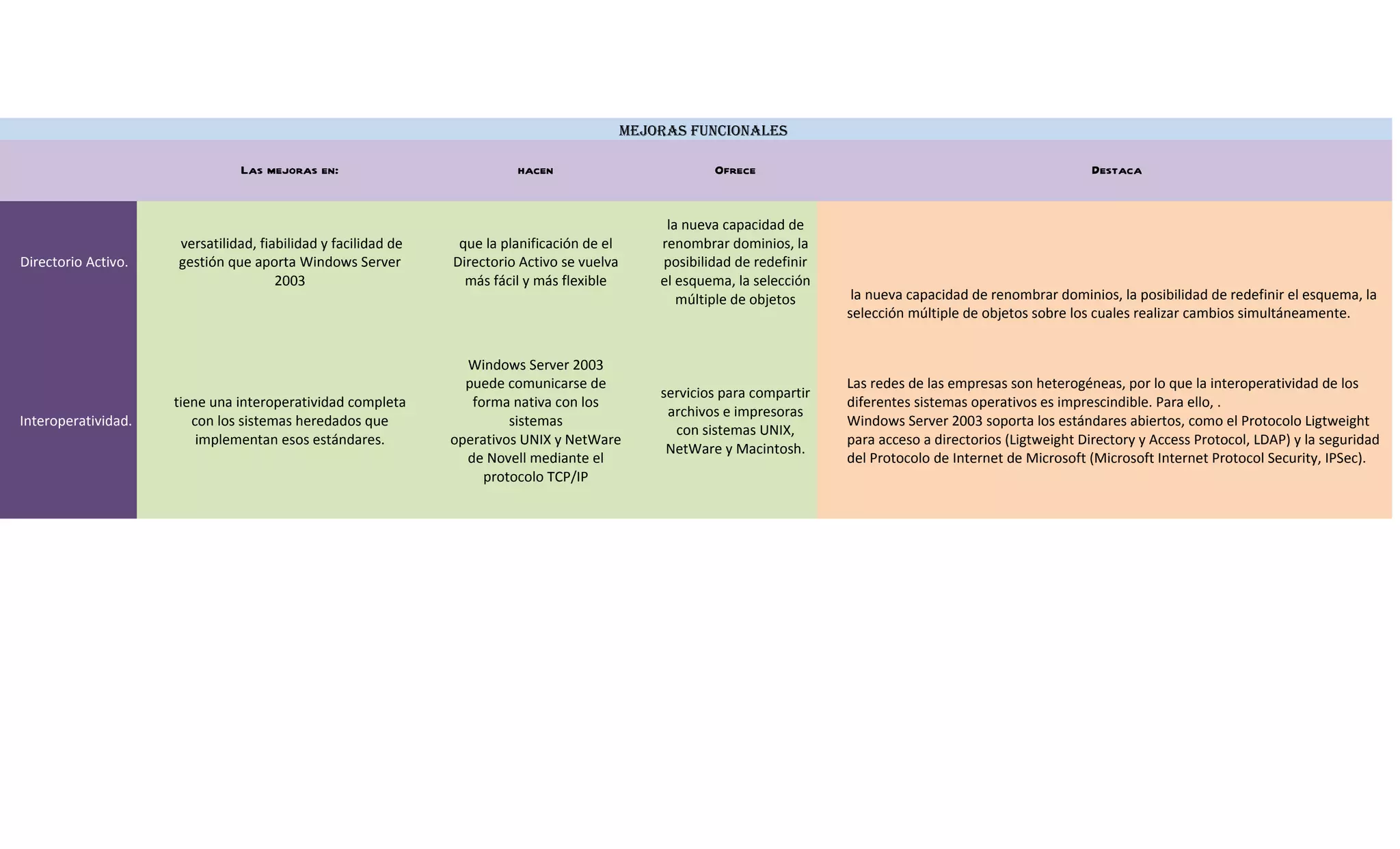 Las mejoras en Windows Server 2003 ofrecen mayor versatilidad, fiabilidad y facilidad de gestión en el Directorio Activo, una interoperatividad completa con sistemas heredados mediante estándares abiertos, y una mejor administración centralizada de recursos y servicios que contribuye a la reducción de costes y el aumento de la productividad.