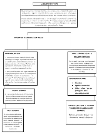 El documento describe los momentos clave de la educación inicial. Comienza explicando que la educación inicial complementa la educación familiar y promueve el desarrollo integral de niños a través de espacios, tiempo y recursos adecuados. Luego describe cinco momentos: 1) La atención inicial enfocada en cuidado y salud versus educación preparatoria, 2) El desarrollo de lineamientos curriculares, 3) La ampliación del derecho a la educación desde el nacimiento, 4) Participantes clave como maestros y niños, 5) Ob