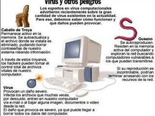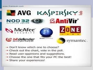 El documento explica la importancia de usar antivirus debido a que diariamente aparecen 30,000 nuevos virus en el mundo. Menciona cuatro de los antivirus más conocidos - Avast, Kaspersky, Panda Antivirus y Nod32. Además, describe tres tipos de virus comunes: caballo de Troya que permite acceso remoto, gusano que se puede propagar, y spyware que espía las actividades e información de los usuarios. Finalmente, concluye que el tema de los antivirus es muy útil ya que su uso es fundamental pero hasta ahora no tenía