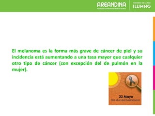 El melanoma es la forma más grave de cáncer de piel y su incidencia está aumentando rápidamente. La exposición excesiva al sol sin protección y el uso de cámaras bronceadoras son factores de riesgo clave. Cada año se presentan aproximadamente 200,000 casos de melanoma en todo el mundo, de los cuales 44,000 desarrollan metástasis y representan el 90% de las muertes por cáncer de piel.