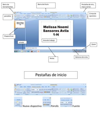 El documento describe las diferentes barras de herramientas y pestañas disponibles en una presentación de diapositivas, incluyendo opciones para insertar elementos, diseñar la página, revisar y ver la presentación. Se mencionan pestañas y botones para títulos, vistas, zoom, notas, formatos, temas, diseño de página, animación, monitores, idioma y comentarios.