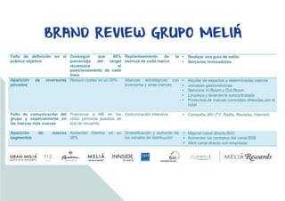 El documento presenta el plan de marketing anual de 2016. Resume los objetivos principales de aumentar los ingresos totales un 8% mediante un aumento del 35% de clientes y mejorando el reconocimiento de la marca. También busca reducir los costes fijos en un 20% y posicionarse entre los primeros 5 puestos en los tests de marca.