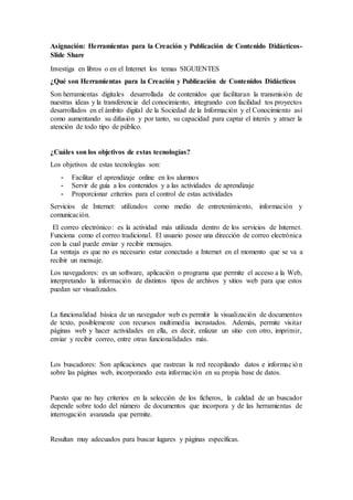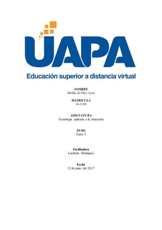 Este documento presenta la tarea 5 de la asignatura Tecnología Aplicada a la Educación para la estudiante Melida de Oleo Lara. La tarea involucra investigar herramientas para la creación y publicación de contenido didáctico como YouTube, SlideShare y Picasa, y luego crear un documento en Word o PowerPoint sobre los temas cubiertos en las unidades 4 y 5 para subirlo a SlideShare.