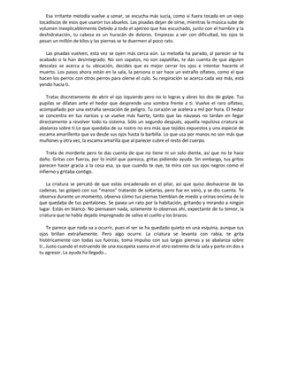 El documento narra la historia de una persona encadenada a un pilar en una habitación abandonada. Está herido, hambriento y deshidratado, sin recordar cómo llegó allí. Escucha ruidos extraños en la casa y pasos que se acercan. De repente, aparece una criatura repulsiva que lo ataca, pero es ahuyentada por un disparo de escopeta que llega justo a tiempo para salvarlo.