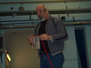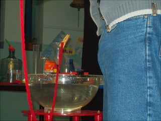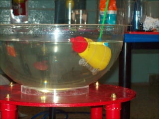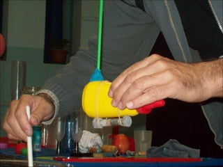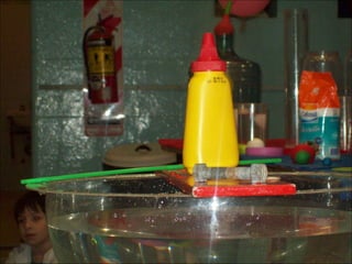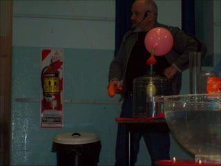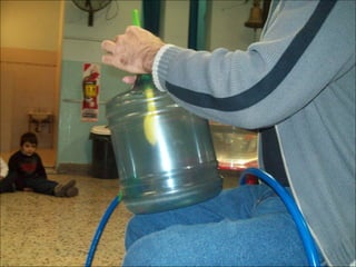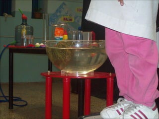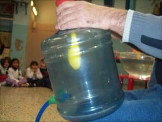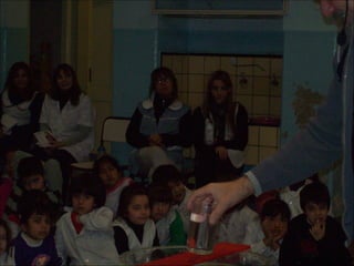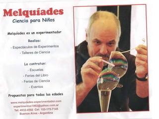 Melquíades visitó una escuela para realizar experimentos con niños sobre objetos sumergidos en agua y una botella con agujeros tapada con agua adentro. Los niños probarían sumergir una aceituna, un zapallo y llenar una botella con agujeros con agua para ver qué sucede y aprender sobre los conceptos científicos involucrados.