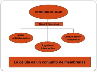 La membrana celular tiene 3 funciones principales: aislar selectivamente la célula, permitir la comunicación intercelular y regular el intercambio de sustancias. Está compuesta principalmente por fosfolípidos, colesterol y proteínas. Siguiendo el modelo del mosaico fluido, la membrana tiene una estructura dinámica formada por una bicapa lipídica y proteínas móviles.