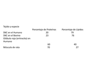 La membrana celular de diferentes tejidos y especies contiene diferentes porcentajes de proteínas y lípidos, con la membrana del sistema nervioso central humano y bovino teniendo alrededor del 20-23% de proteínas y 76-79% de lípidos, mientras que la membrana de los glóbulos rojos humanos tiene 60% de proteínas y 40% de lípidos y la membrana muscular de rata tiene 70% de proteínas y 27% de lípidos.