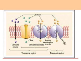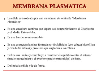 La membrana plasmática es una estructura laminar formada por fosfolípidos y proteínas que delimita la célula y mantiene el equilibrio entre el interior y exterior de esta. Cumple funciones como proteger la célula, crear una barrera selectivamente permeable, y regular el transporte de sustancias a través del transporte pasivo como la difusión y la osmosis, y el transporte activo mediado por proteínas de transporte y vesículas.