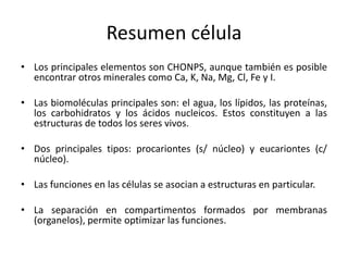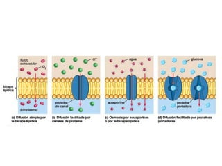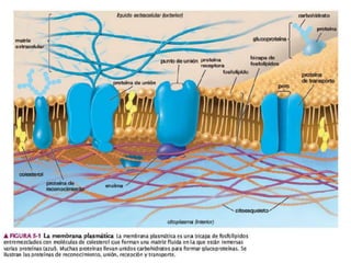 El documento resume los principales componentes y estructura de la membrana celular. La membrana está compuesta principalmente de lípidos y proteínas. Los lípidos forman una bicapa que permite la separación de compartimentos, mientras que las proteínas cumplen funciones como el transporte a través de la membrana. La permeabilidad y fluidez de la membrana dependen de factores como la temperatura, composición lipídica y presencia de colesterol.
