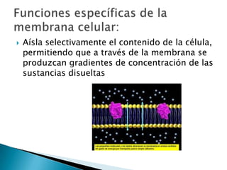 La membrana celular aísla el contenido de la célula permitiendo la comunicación selectiva. Está compuesta de fosfolípidos y proteínas que regulan el paso de sustancias a través de procesos como la difusión, el transporte activo y la endocitosis. La membrana mantiene la homeostasis celular al controlar los gradientes iónicos y el movimiento de moléculas.