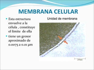 El documento resume la estructura y función de la membrana celular. La membrana está compuesta principalmente de proteínas (60%) y lípidos (40%), los cuales forman una bicapa lipídica que envuelve y delimita la célula. Las proteínas cumplen funciones como transporte, reconocimiento y adhesión, mientras que los lípidos proveen la estructura básica. La membrana es semipermeable y controla el paso de sustancias a través de ella mediante transporte pasivo como la difusión, y transporte activo que