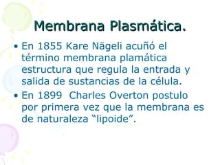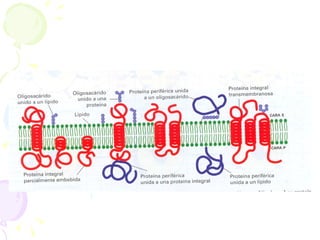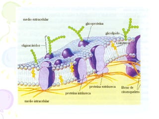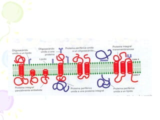 La membrana plasmática está compuesta por una bicapa lipídica de fosfolípidos que contiene proteínas intercaladas. Está compuesta de lípidos, proteínas y carbohidratos que le dan su estructura dinámica y le permiten regular la entrada y salida de sustancias hacia y desde la célula. Su función depende de la composición y distribución de sus moléculas.