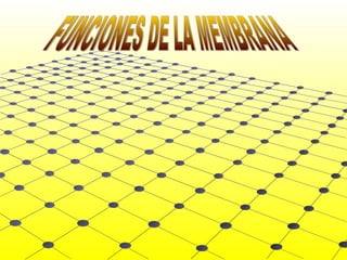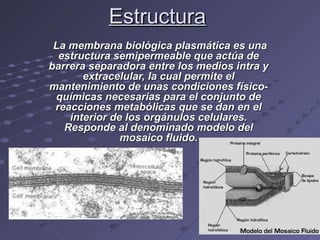 El documento describe los componentes estructurales y funciones de la membrana celular eucariótica. La membrana está compuesta principalmente por una bicapa lipídica de fosfolípidos y colesterol que le confiere propiedades de autoensamblaje, autosellado, fluidez e impermeabilidad. También contiene proteínas integrales y periféricas, así como un glucocálix externo. La membrana controla el paso de sustancias a través del transporte pasivo y activo, y participa en interacciones celul